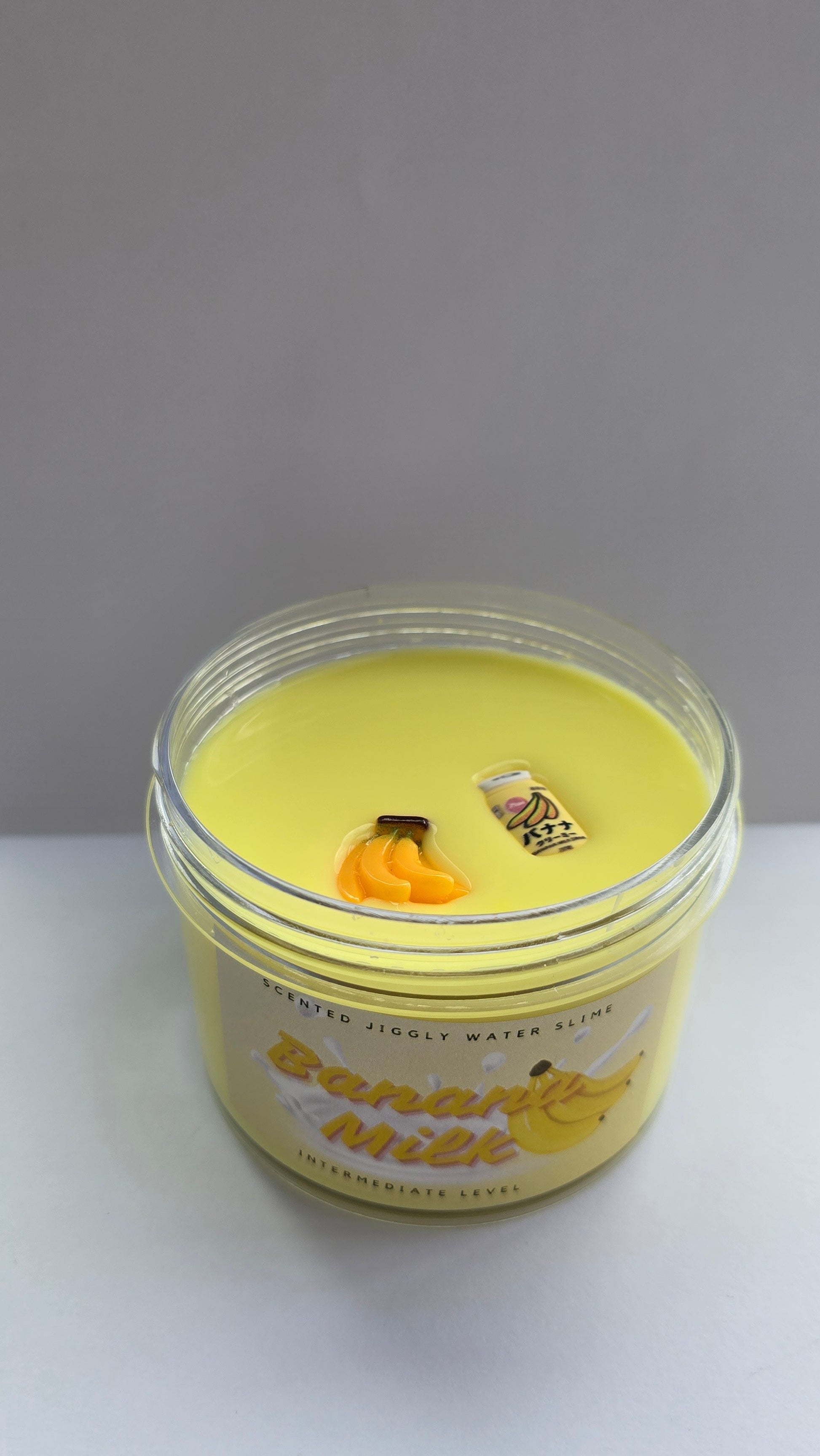 Banana Milk is a Jiggly Water slime which is watery, non-tacky, and jiggly. This slime isn't for normal slime things like stretching and inflating, but it's very fun to poke and wiggle it to make watery sounds! Since this slime is jiggly, it's best for table-play. It's satisfying to cut the slime to pieces using scissors or be innovative and try your own ways to play with it. Scented banana and topped with banana Milk bottle and bunch of bananas
