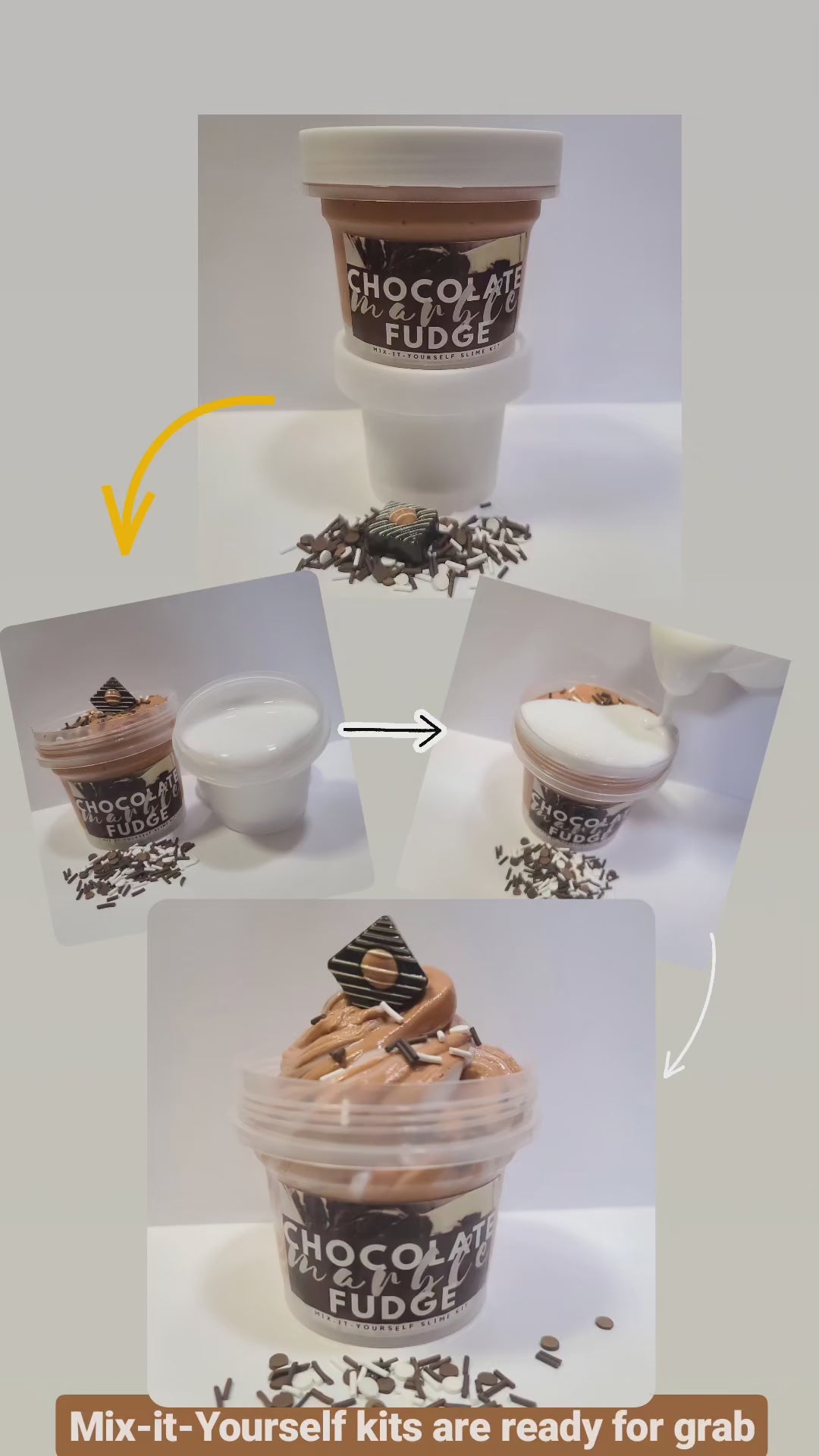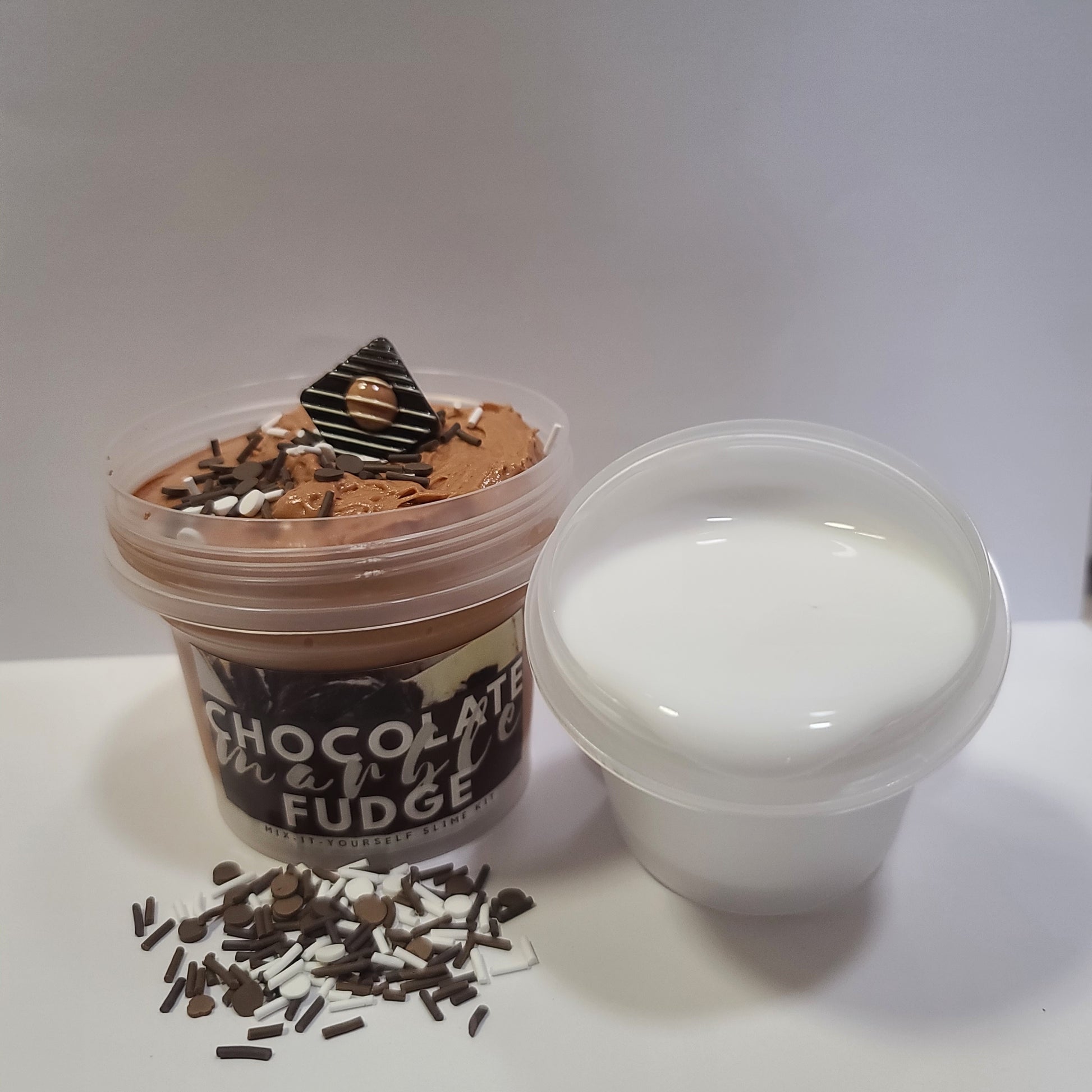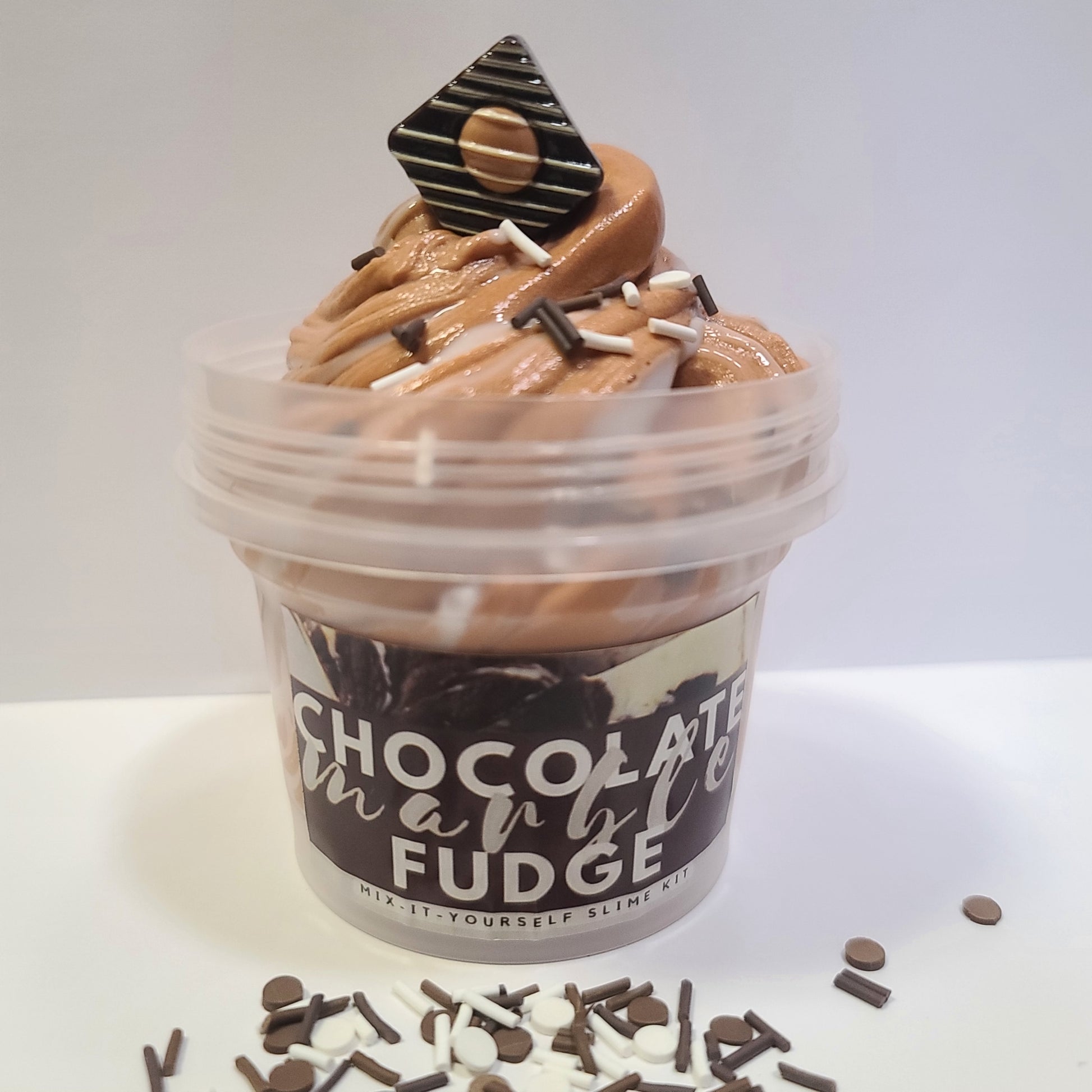 A chocolatey smooth butter slime and vanilla scented white thick glossy slime packed in 2 separate containers. On mixing it creates a beautiful marble swirls and becomes super smooth and fluffy slime that is amazing for pops and clicks. Comes with brown/white sprinkles and realistic Fudge charm.