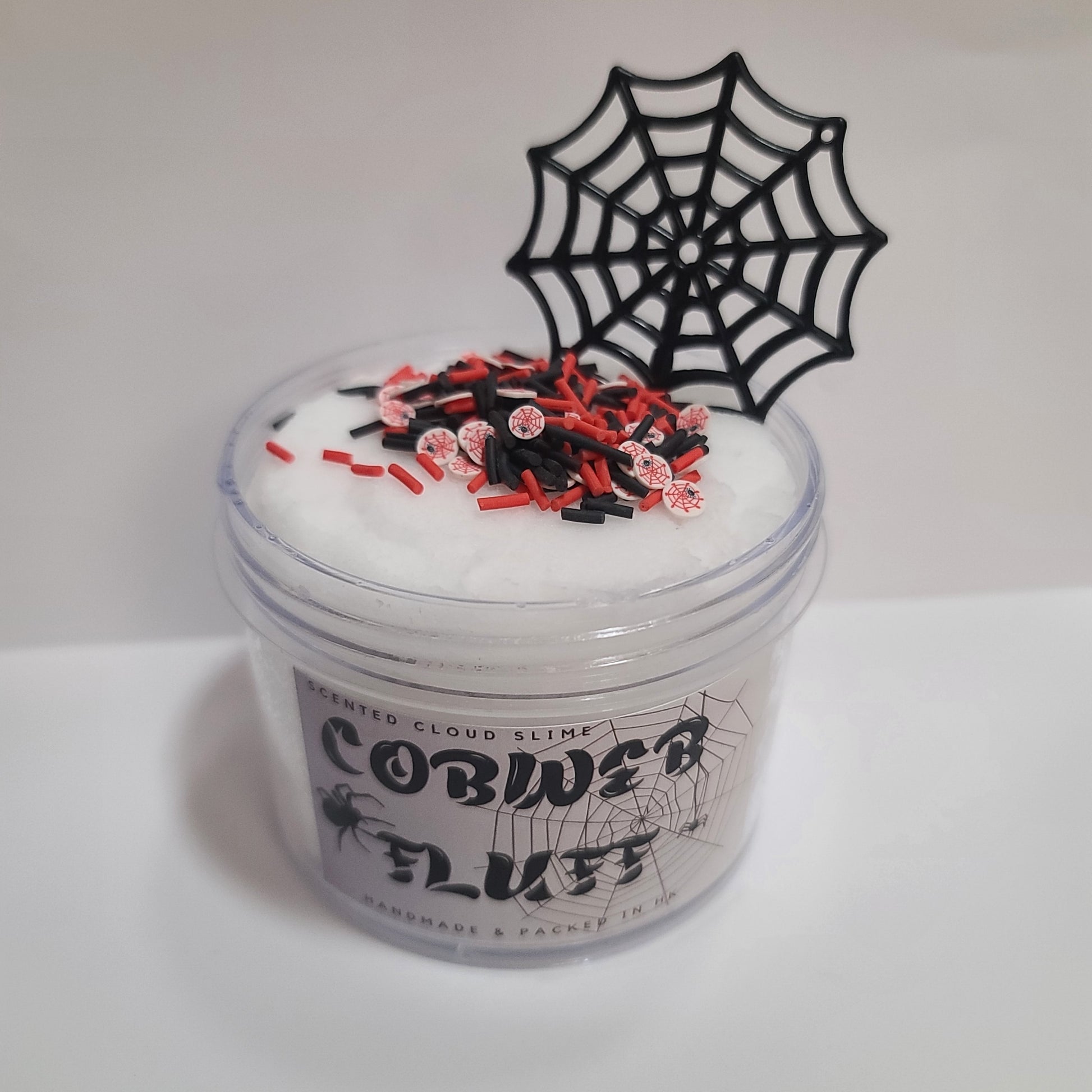 Cobweb Fluff is a white Cloud textured slime. Its topped with colored sprinkles and a Large Cobweb charm. Ultra soft + drizzly cloud slime texture for endless fun!