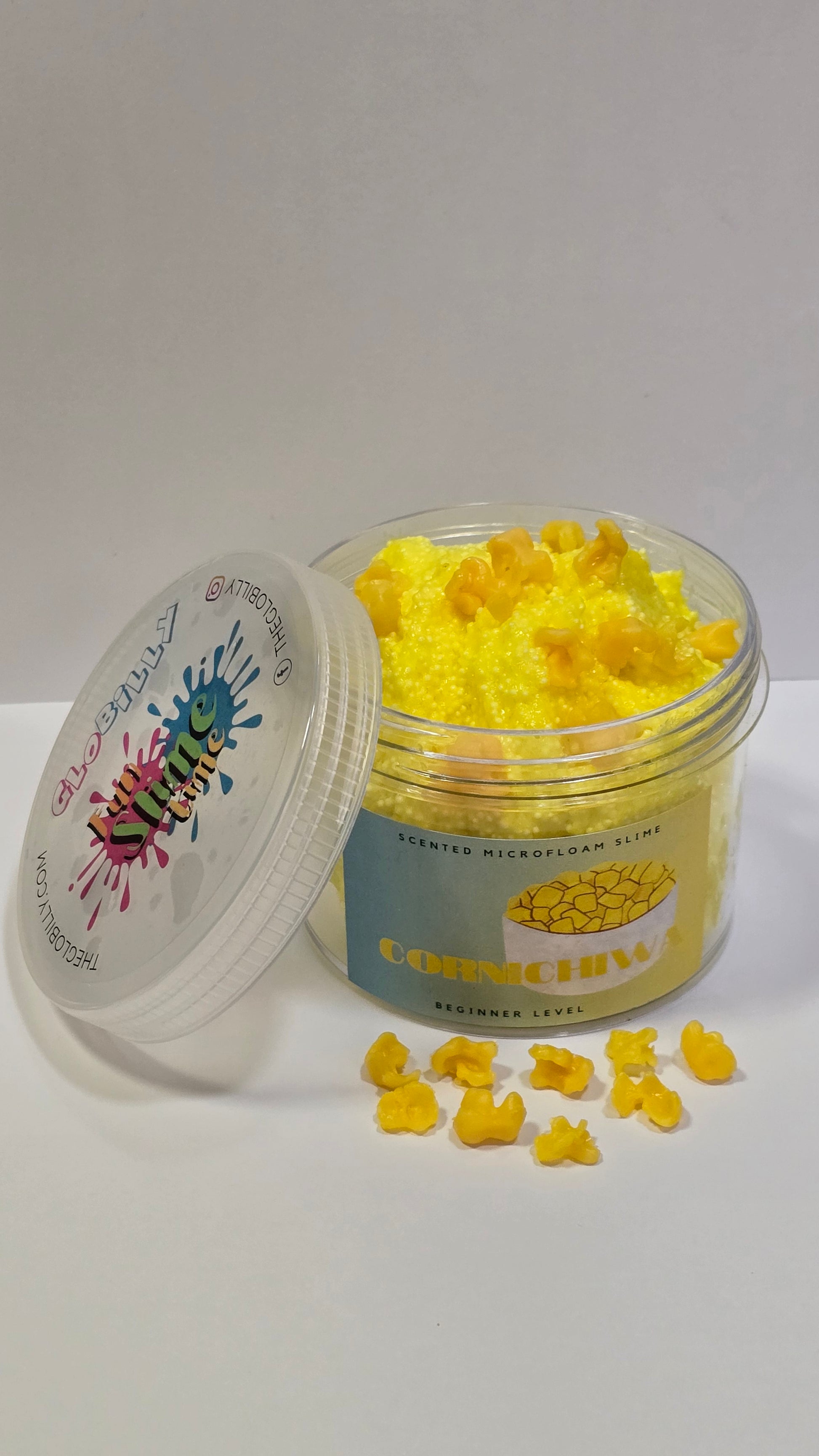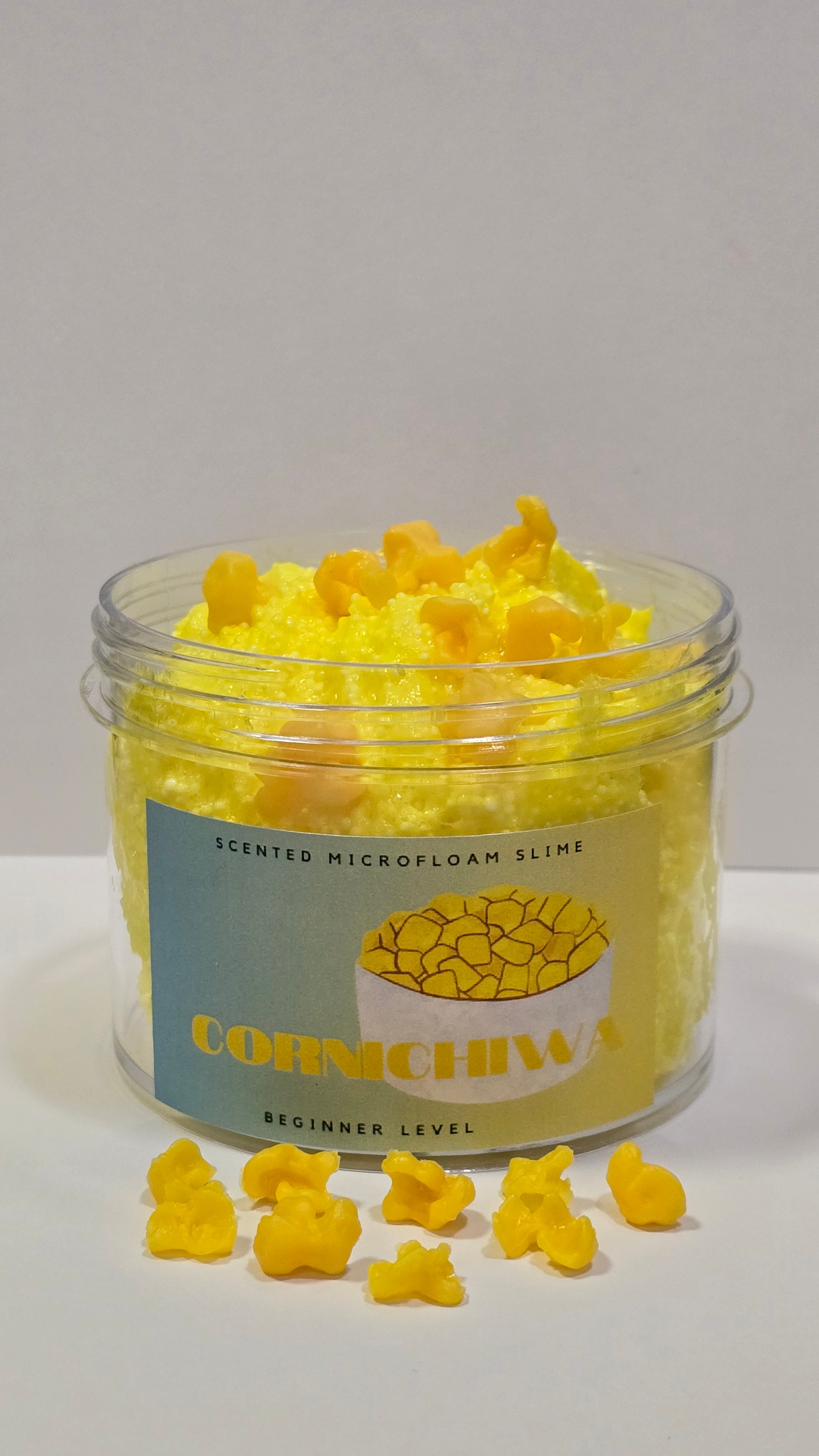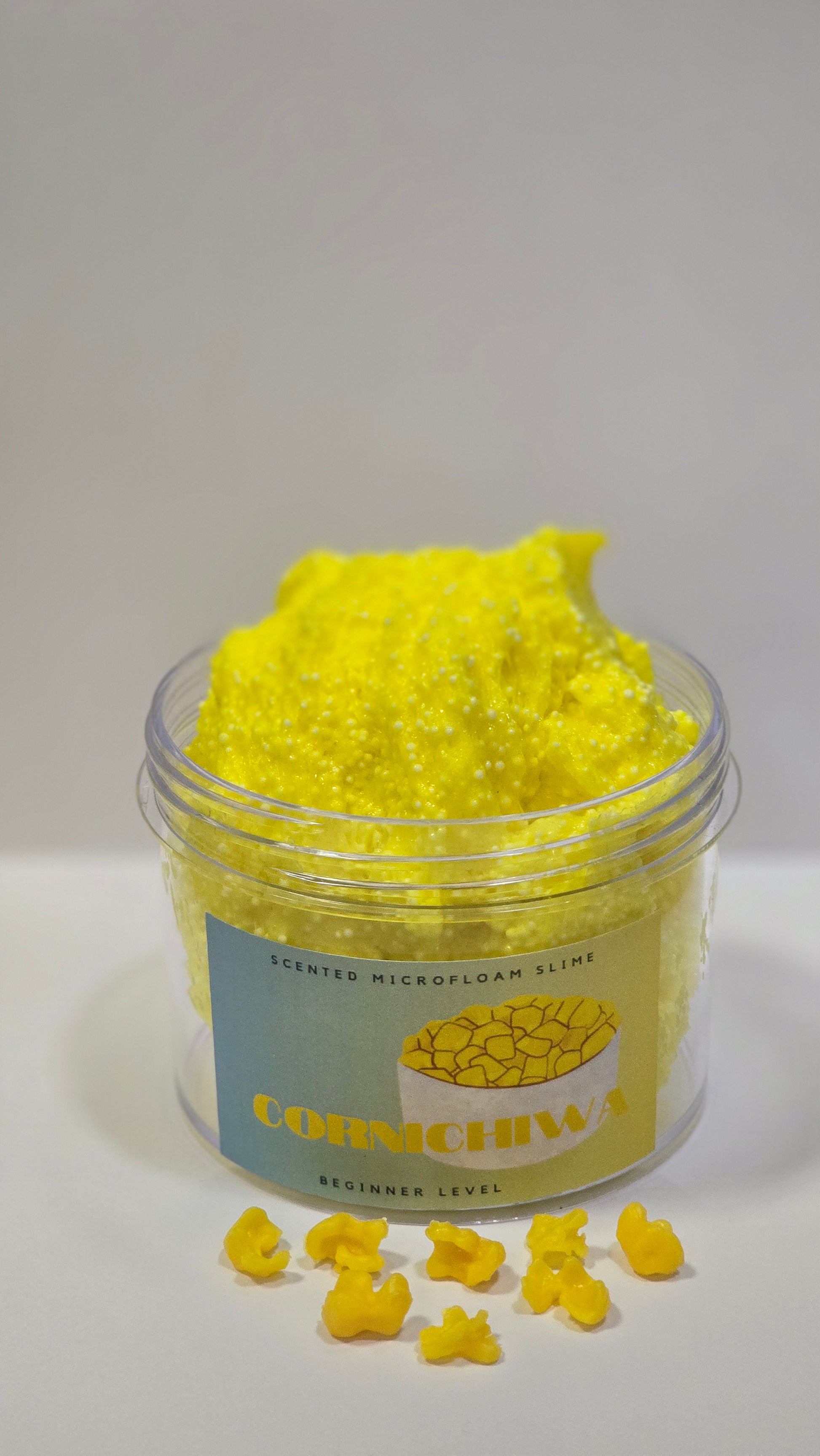 Cornichiwa is the crunchiest microfloam that is so fun to play with! This slime is a combination of a yellow clear slime mixed with loads of white micro foam beads to assure an amazing crunch. It is scented like sweet corns and topped with fake corn kernels.