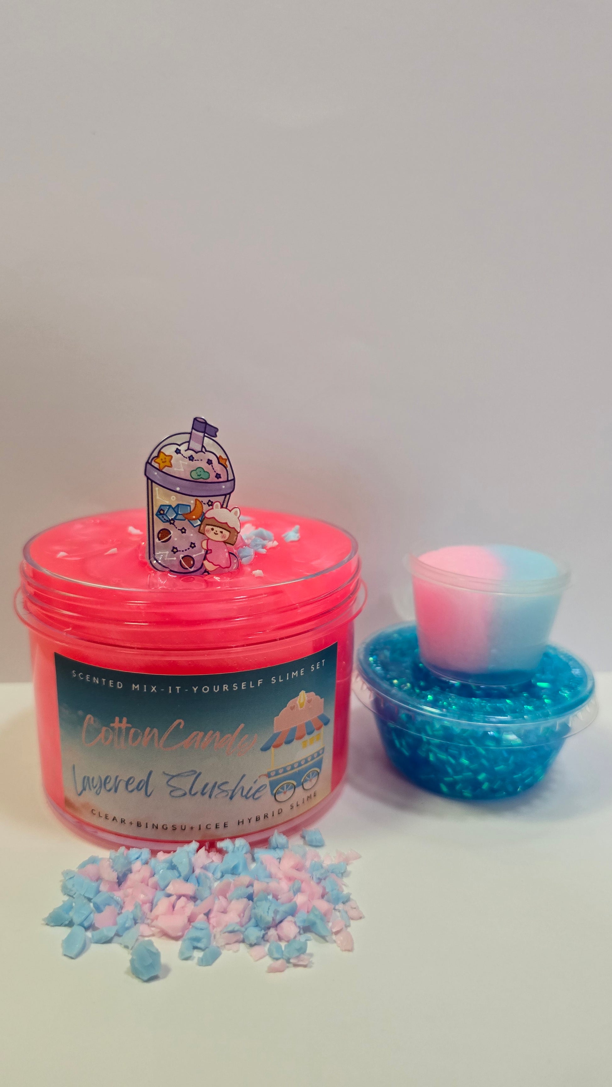 Cotton Candy Layered Slushie has a pink coated clear base that has a lighter pink shimmer to it. You can enjoy it as own or mix. It comes with a 2 oz bright blue bingsu slime and an oz of Gelato icee slime that's half pink and half blue. Scented like yummy, fluffy cotton candy! Topped with cute Boba Drink charm, a cotton candy popping candy sprinkle mix. This mix is so cute!. Once mixed, it turns into a juicy jelly with a slight bingsu texture. This beauty inflates and sizzles!