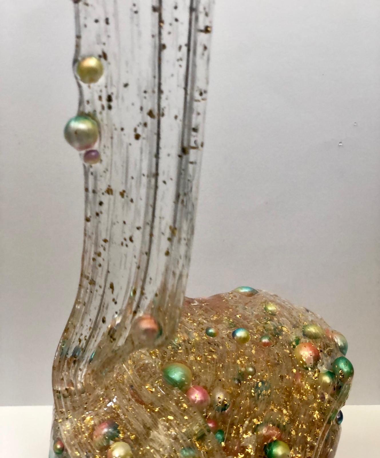 This slime features a thick, clear base with gorgeous pearls and gold glitter to resemble dragon's egg.
