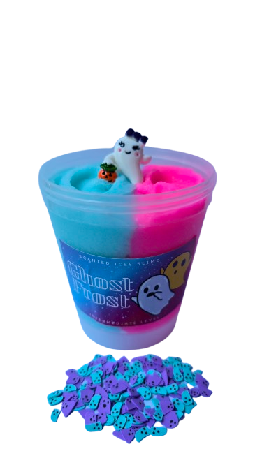 Ready for some spooky-sweet fun? Enjoy icee goodness with this Ghost Frost slime! The Deep Pink and Torquoise icee slime scented sweet rock candy is topped off with ghost fimos...perfect for a hair-raising Halloween! boo-yah!