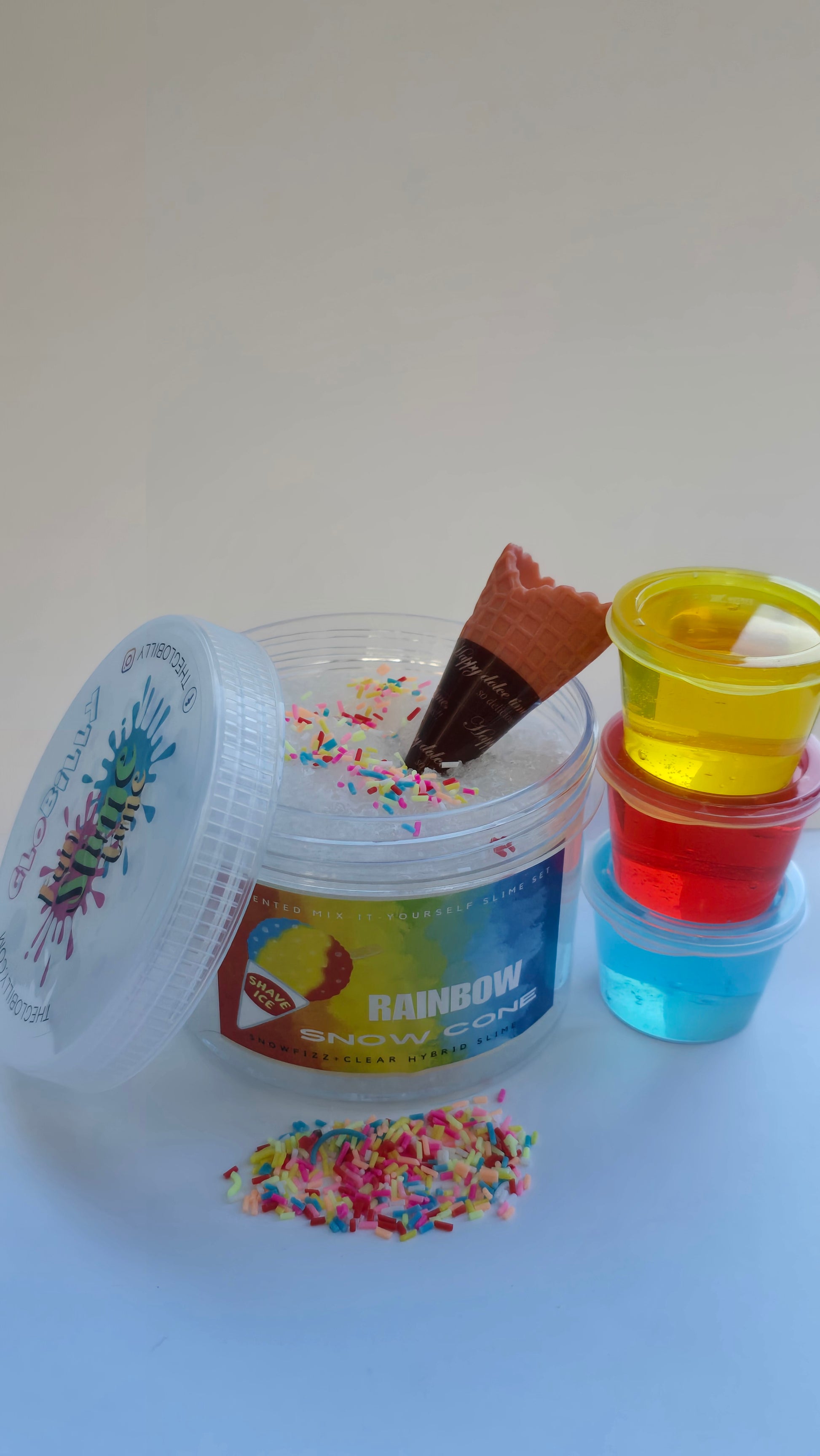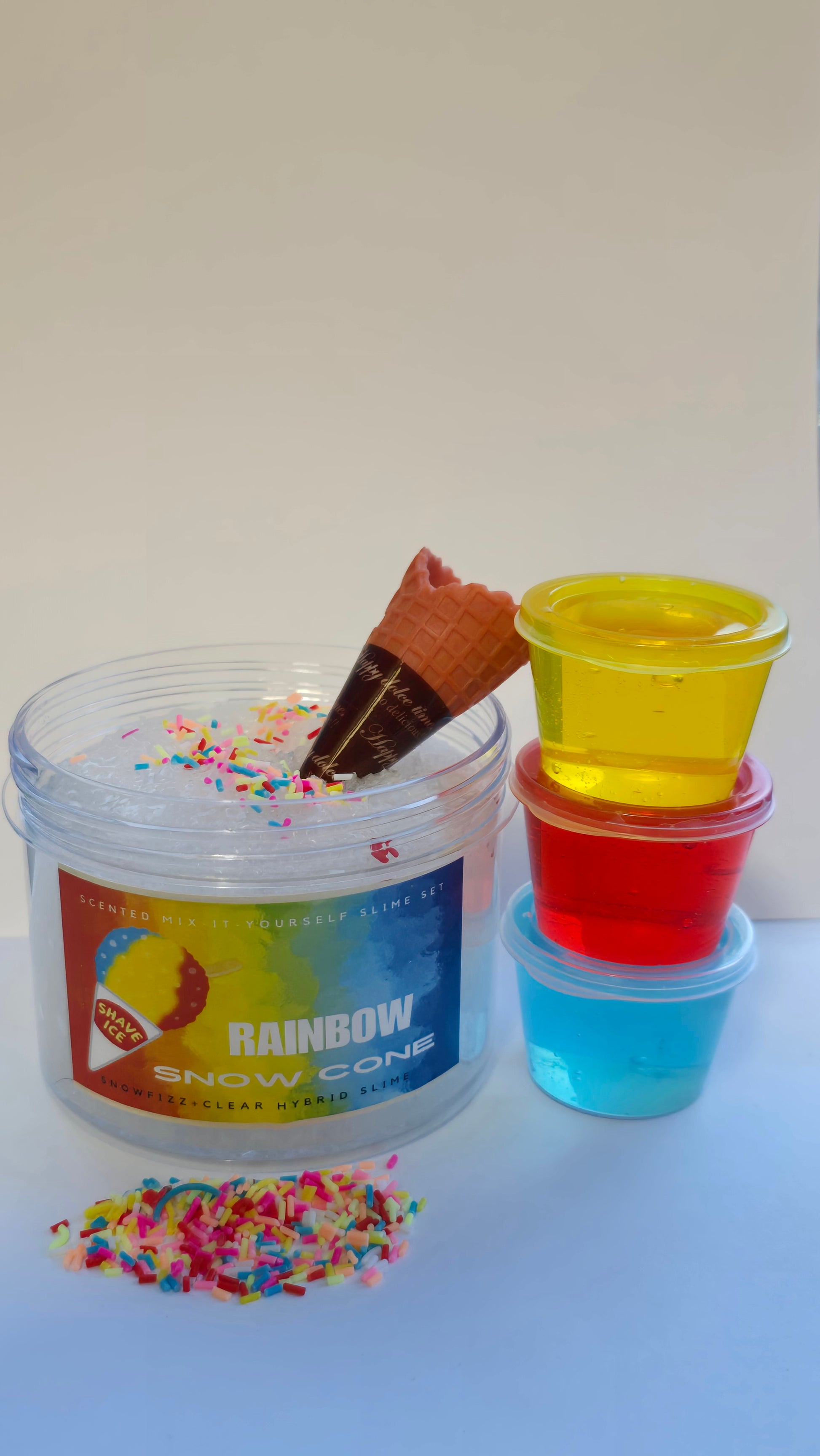 Indulge in a summer carnival favorite with our Rainbow Snow Cone! This DIY slime set comes with a 7 oz snowfizz Slime and 3 rainbow colors clear slime packed in 3 separate containers. It's scented hard candy. Topped with sprinkles and waffle cone