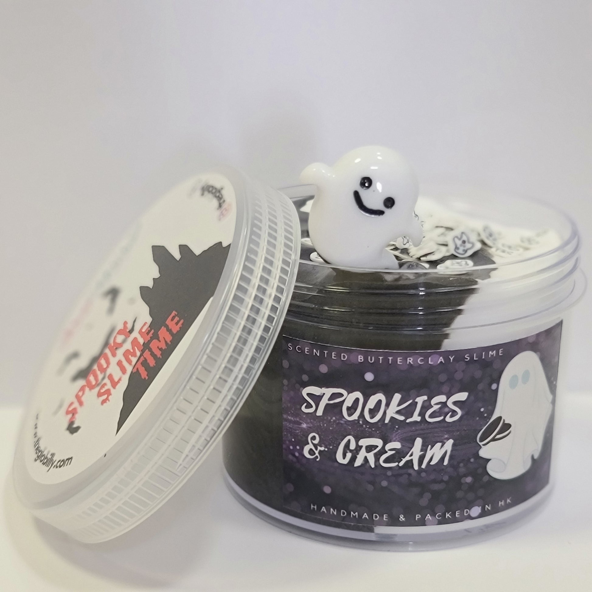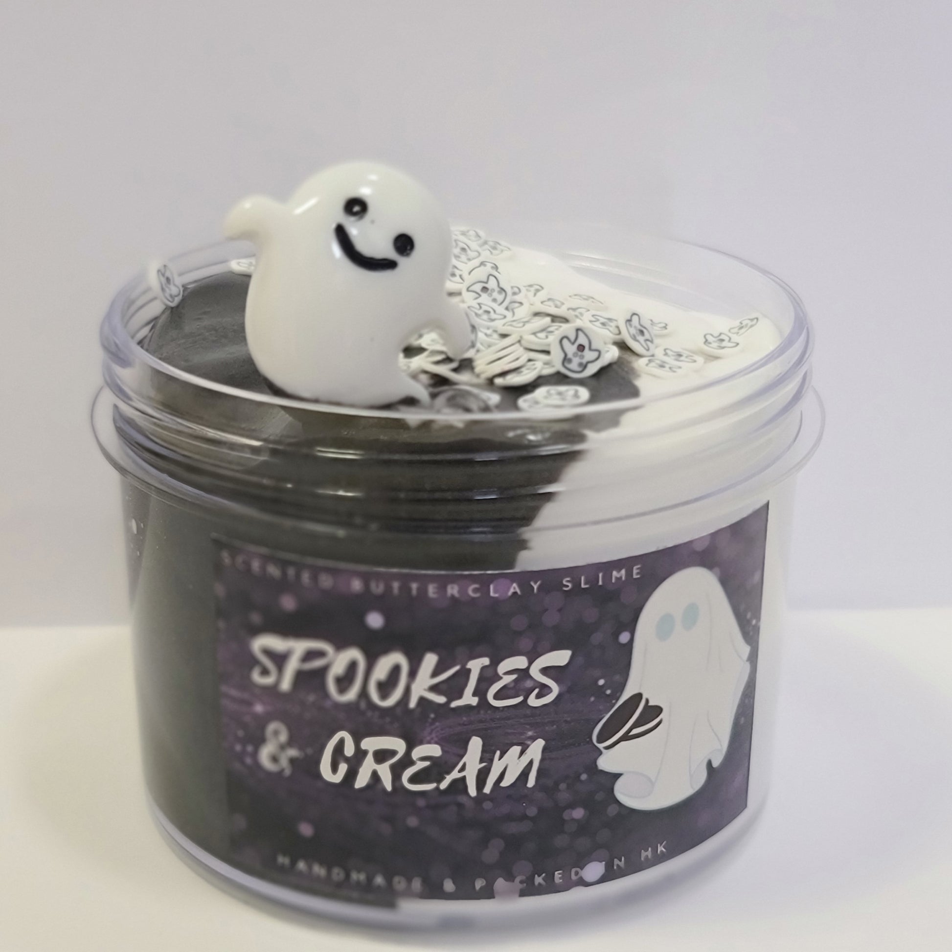 White and Black Butter Clay slime texture great for beginners, easy to hold and play with, topped with spooky sprinkles and a cute Ghost charm.