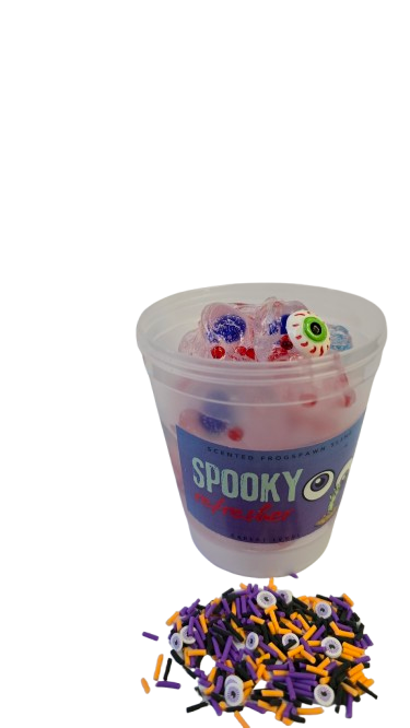 This Refresher is perfect for any Halloween spook-bration! This frogspawn bead slime contains an exciting mix of bead-packed thick clear putty slime & topped with an ice-cube charm, Halloween colored fimos mix and eyeball charm for an extra spooky touch! Scented lemon ice tea.