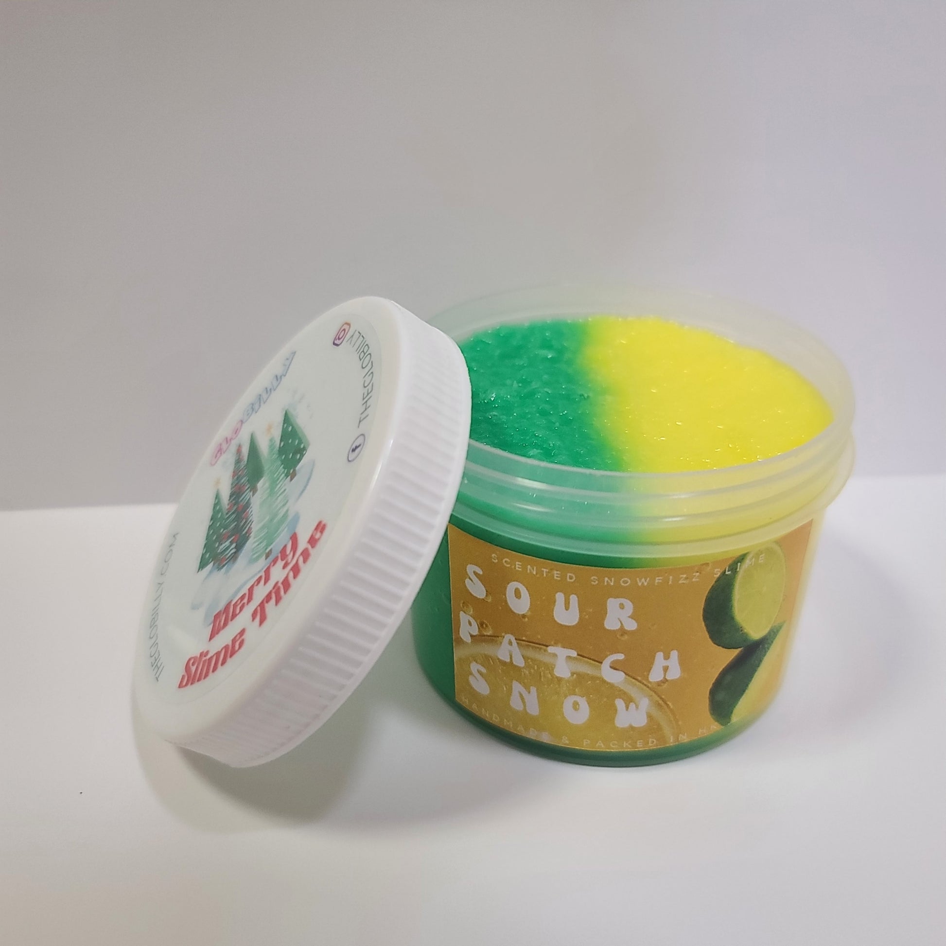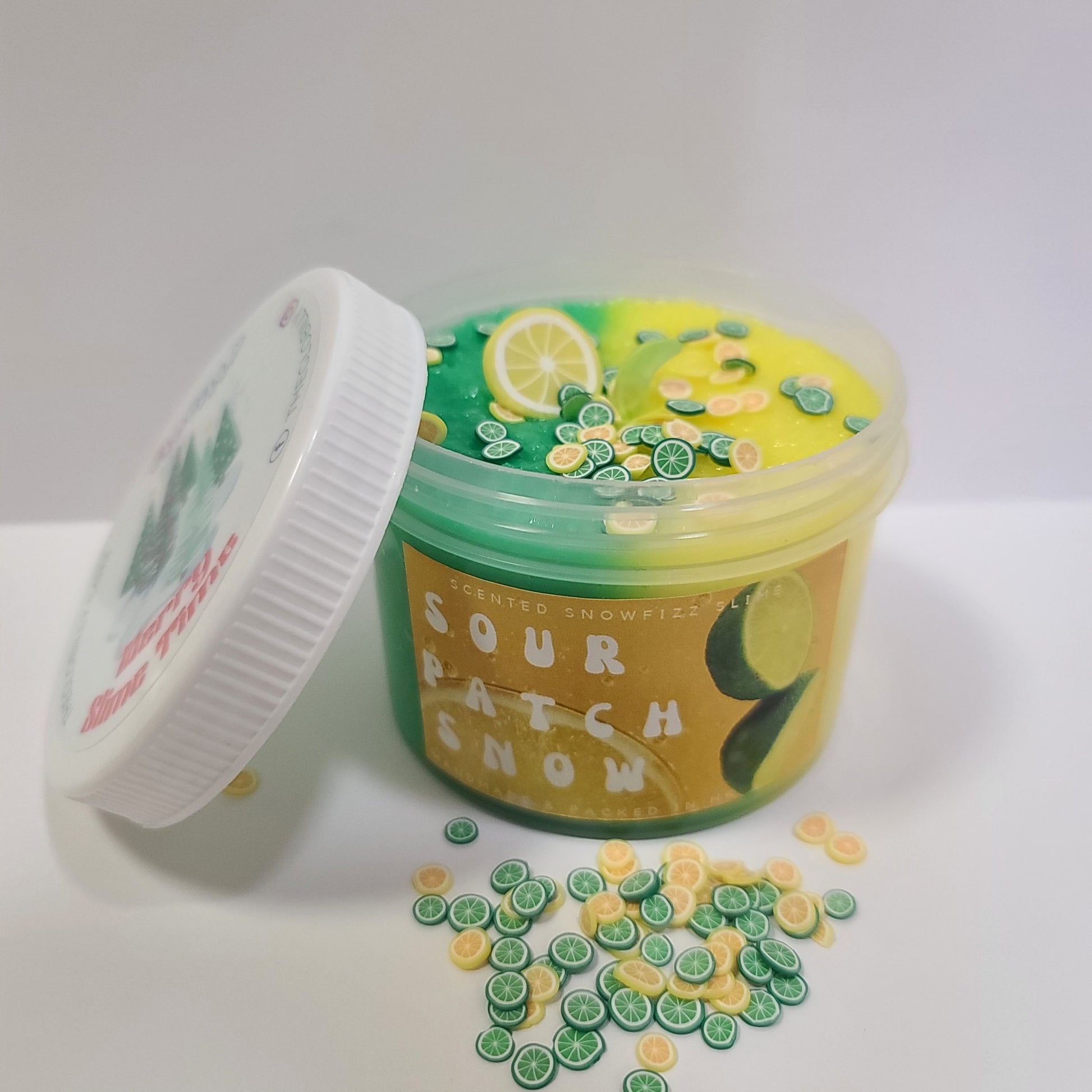 This is a crunchy snow fizz slime that comes with fake lime and lemon fimos for you to decorate the slime yourself! This slime makes amazing bubble pops and crunches. It is super inflating and smells real sour!